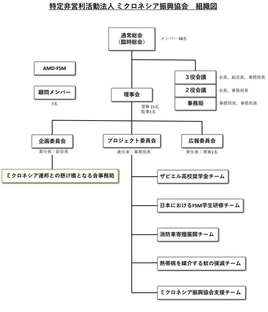 この法人は、ミクロネシア連邦の発展と日本との連帯に関する事業を、健全なる信義により行い、この事業を通じて、南太平洋ミクロネシア地域と日本との相互理解に寄与することを目的とする。